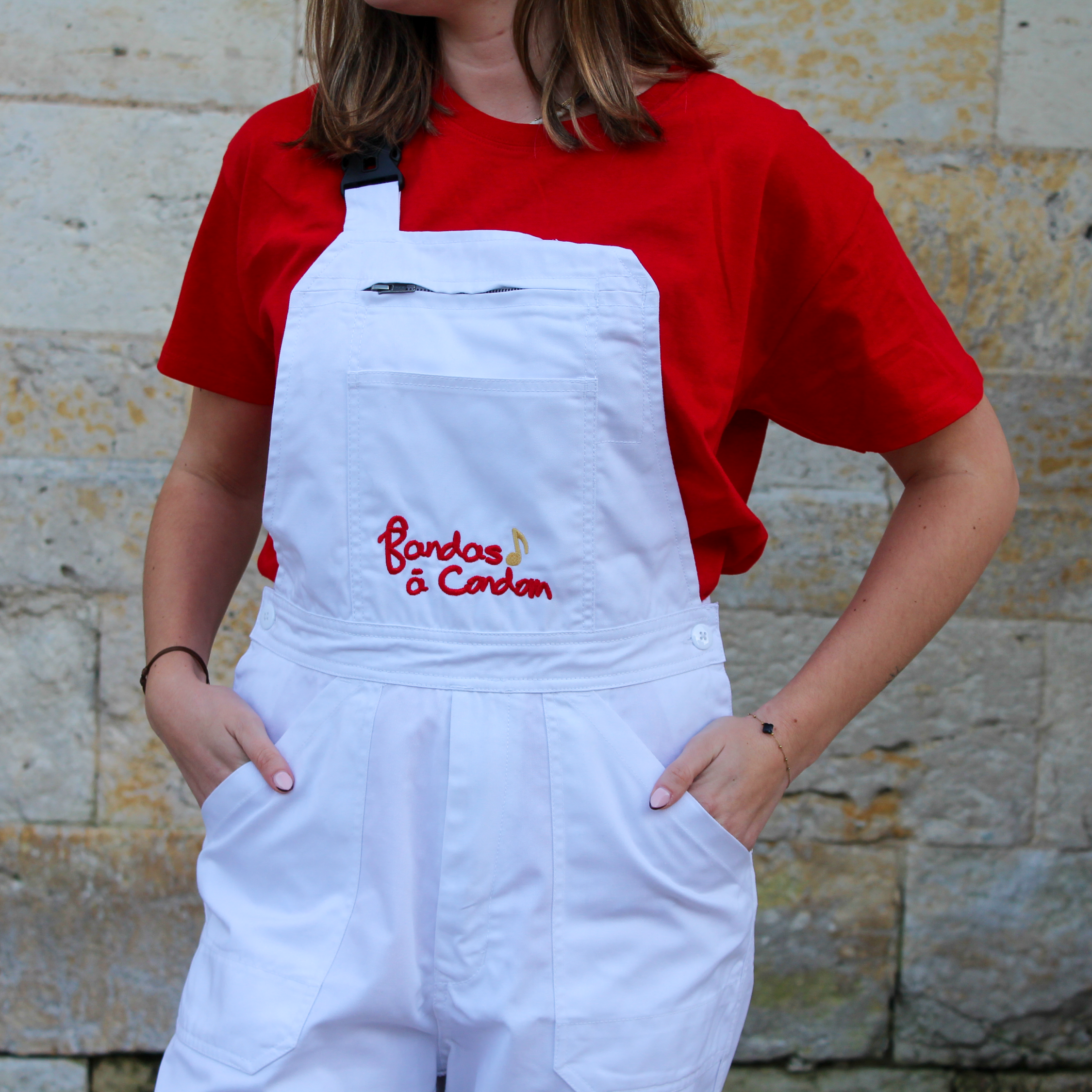Un emblème de la tenue festayre, notre salopette blanche est brodée du logo Bandas à Condom sur sa poche principale. Une grande poche zippée vous permettra d'y ranger vos biens en toute sécurité.