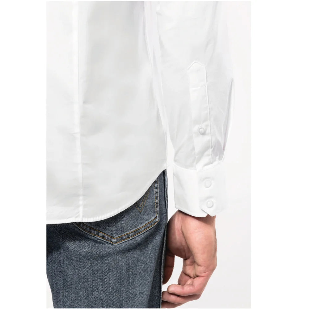 Aisance et ajustement idéal de par son côté stretch. Pointe de col baleinée. Boutons ton sur ton. Empiècement dos double. Pinces taille dos. Finition coutures rabattues. Poignet à angles abattus à 2 boutons avec patte de manche capucin boutonnée. 2 boutons de rappel. Bas arrondi.
